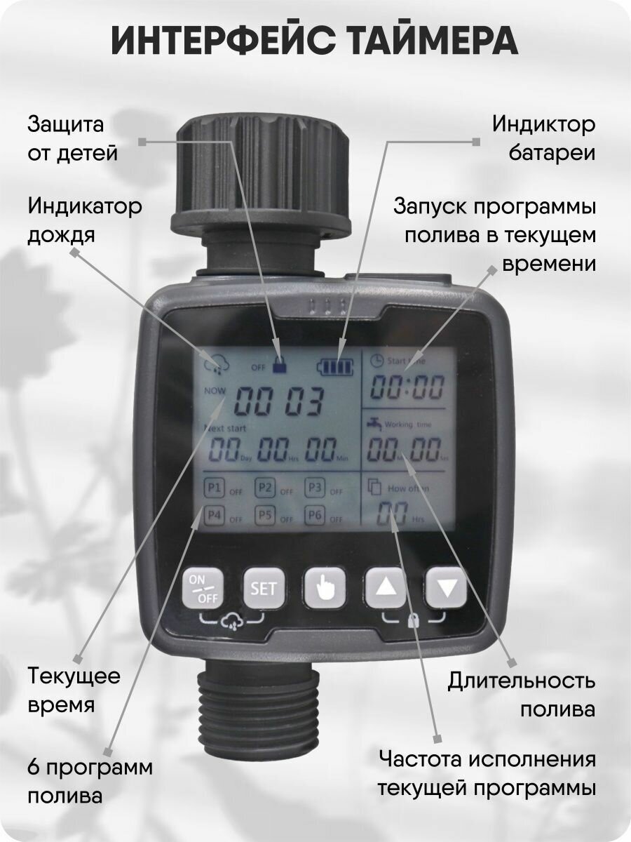 | Комплектация | Таймер полива - 1шт, тройник - 1шт, фитинг для трубки капельного полива - 2шт, быстросъёмный фитинг - 1шт. комплект батареек - в подарок. |