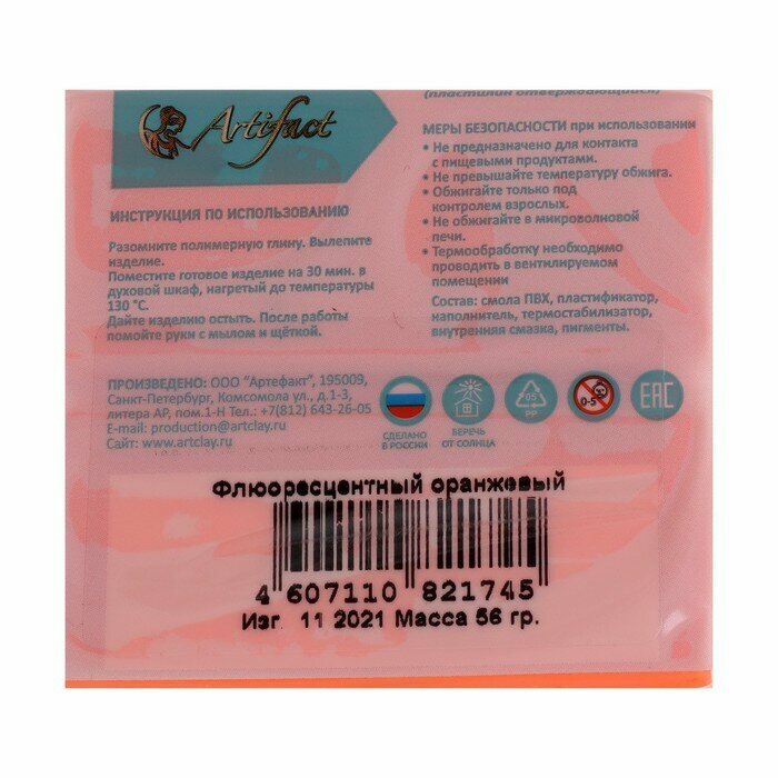 Artifact Пластика - полимерная глина 56г флуоресцентный Оранжевый информация: