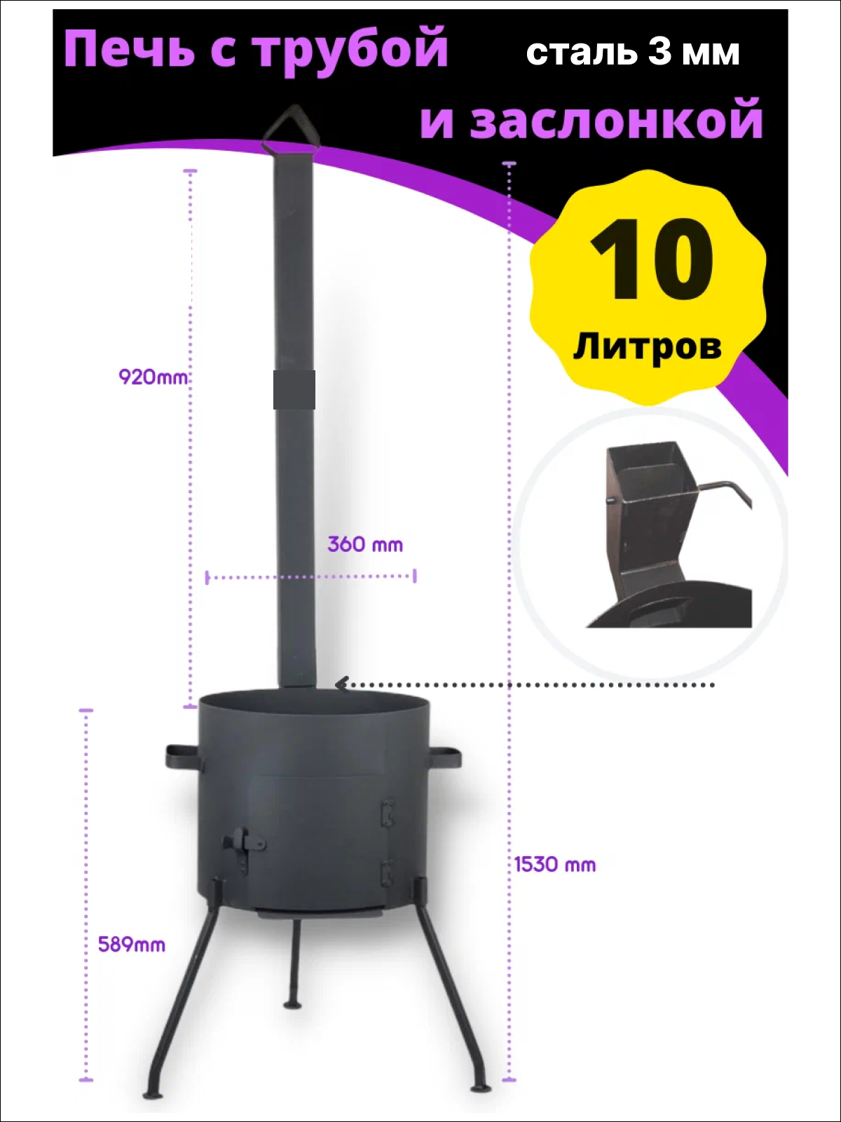 Комплект - печь из стали 3 ММ с трубой и дверцей и казан чугунный 10 литров плоское дно с шумовкой и информация: