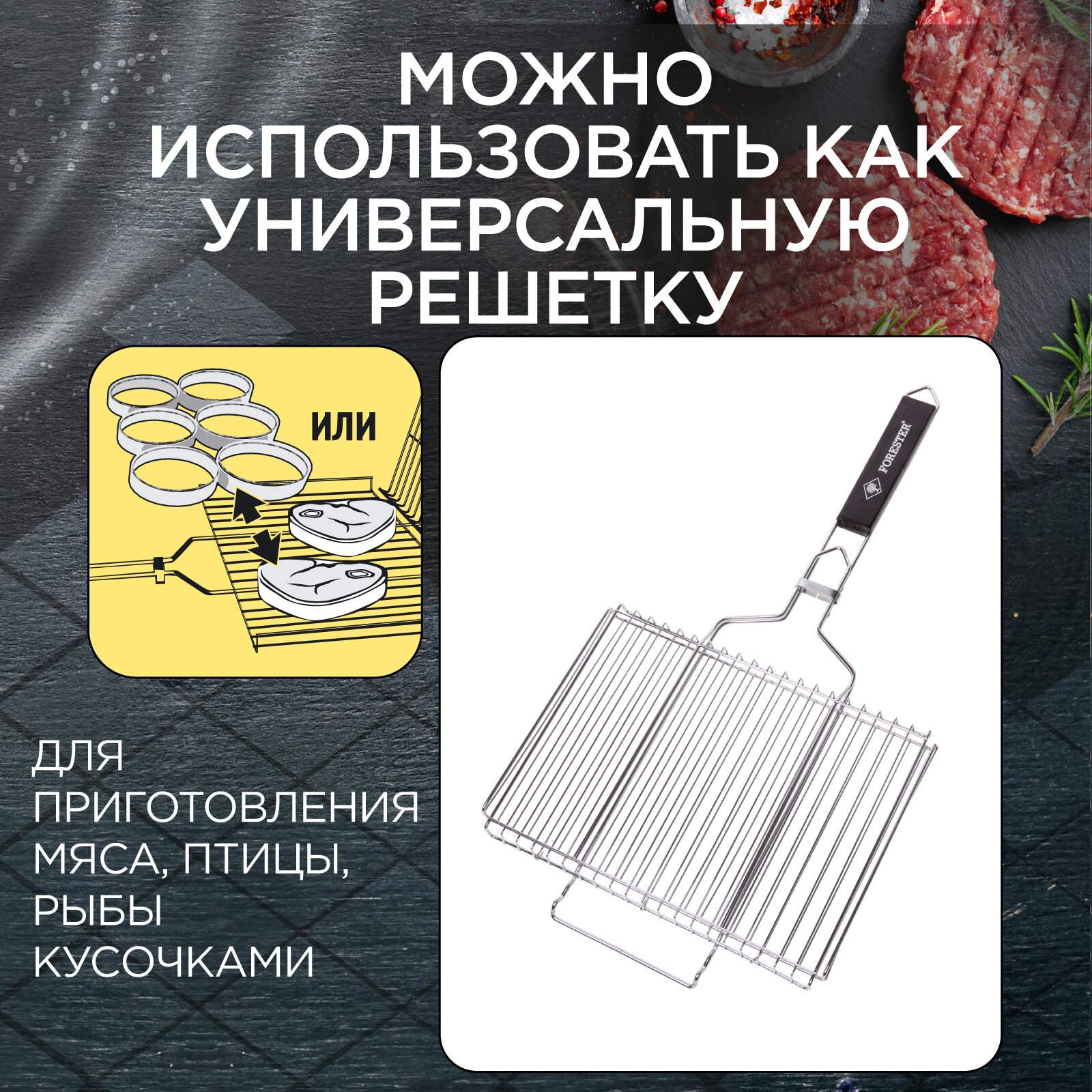 Решетка Forester Решетка - гриль, для мангала, FORESTER 26*38 см объемная большая, нержавеющая сталь с ручками из каучукового дерева