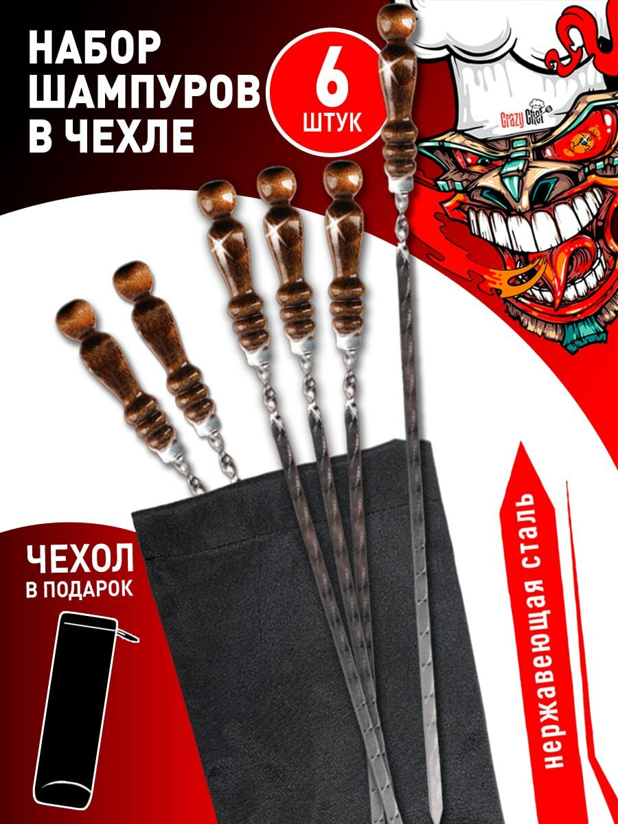 10 цен на Набор шампуров 62 см 6 штук в чехле / Шампуры из нержавеющей стали с деревянной ручкой из бука
