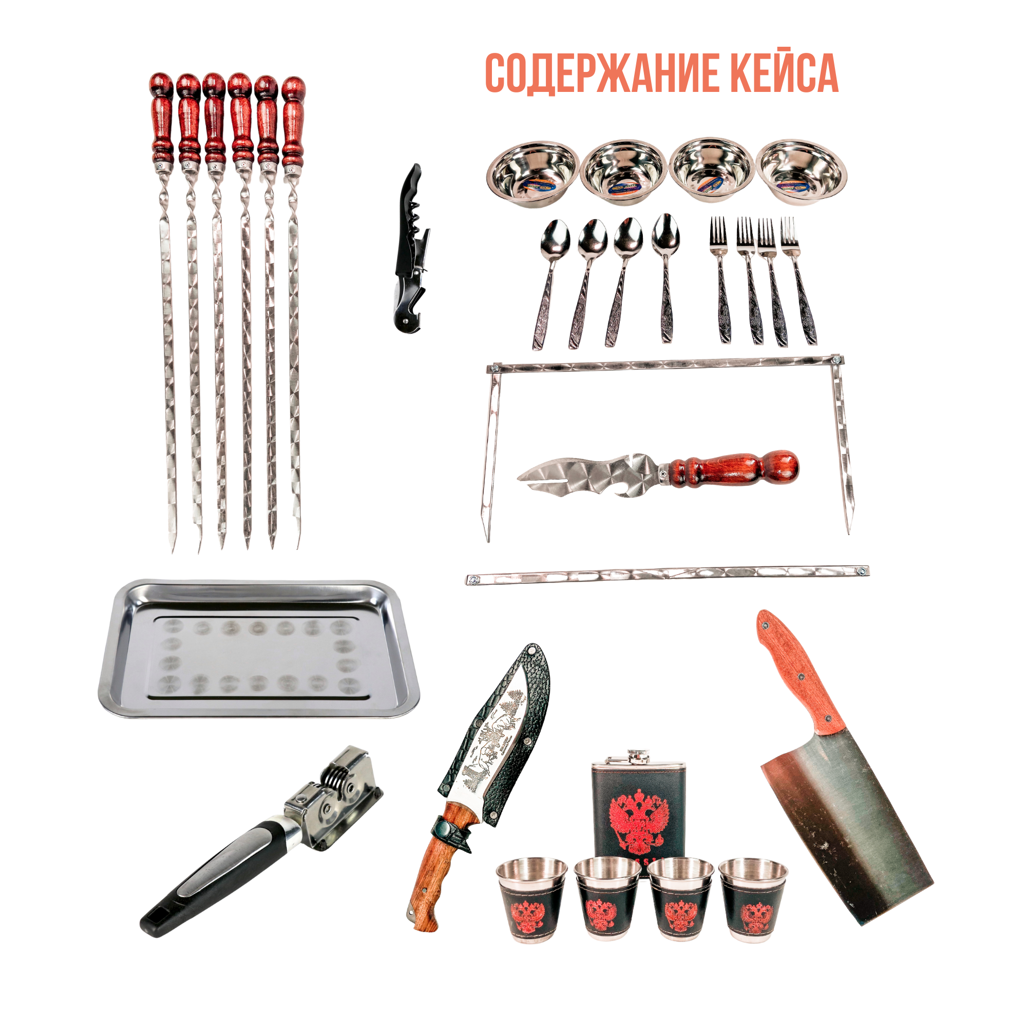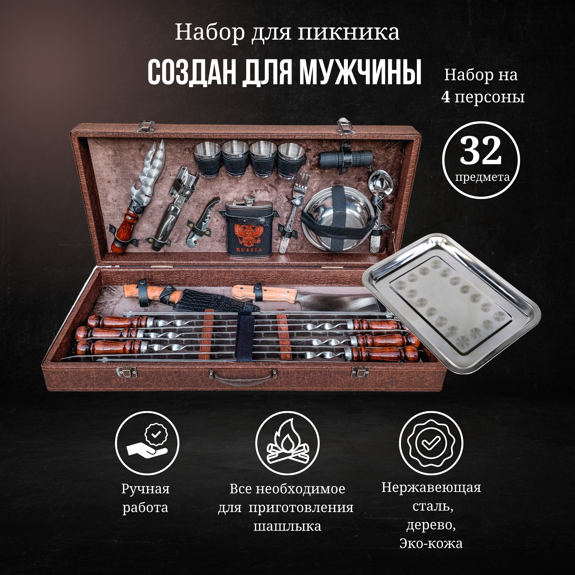 | Комплектация | 6 шампуров с деревянной ручкой, мангал (таганок), нож разделочный (Кизляр), топорик кухонный, фляга из нержавейки, набор посуды на 4 персоны ( по 4 шт. каждого предмета: миски, ложки, вилки, стаканчики), поднос для шашлыка, фонарик, зажигалка в форме патрона. |