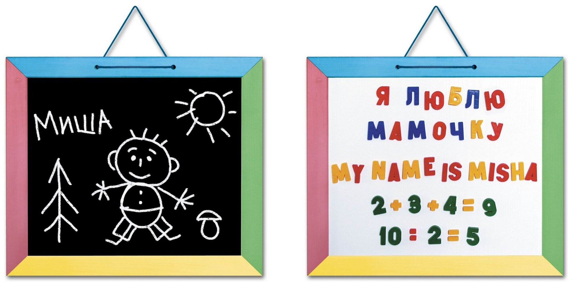 Доска двухсторонняя, обучающая, магнитно-маркерно-меловая Веселые цифры , 36,5см х 26,5см, магнитные цифры и знаки, 45 шт, неокрашенные 02699ДК