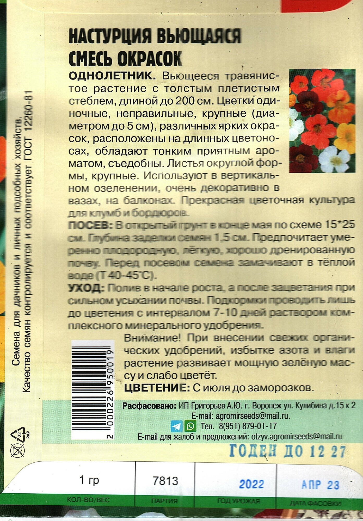 Настурция вьющаяся смесь окрасок, длинна 200 см ( 1 уп: 1 г ) информация: