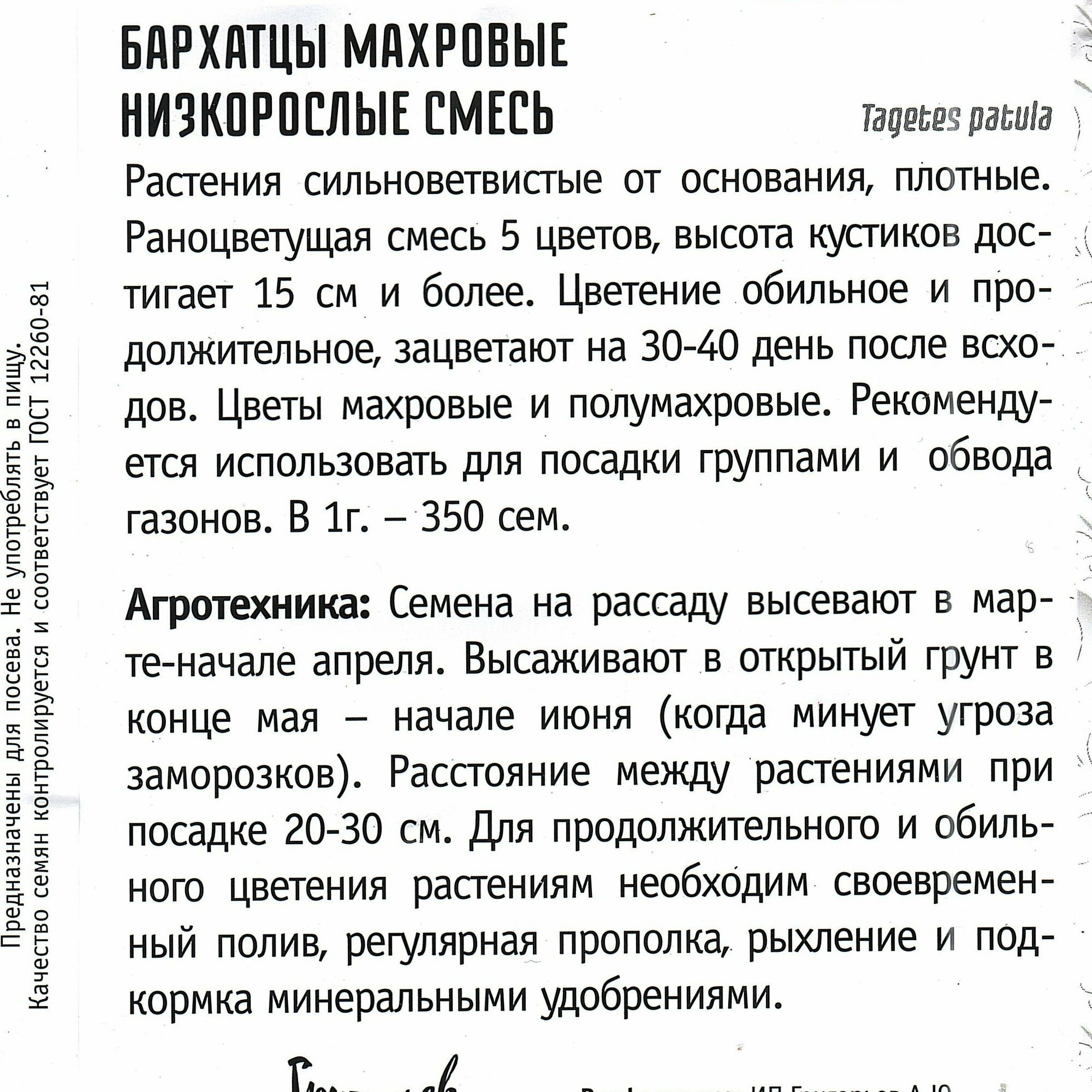 Бархатцы махровые низкорослые смесь ( 1 уп: 100 семян ) информация: