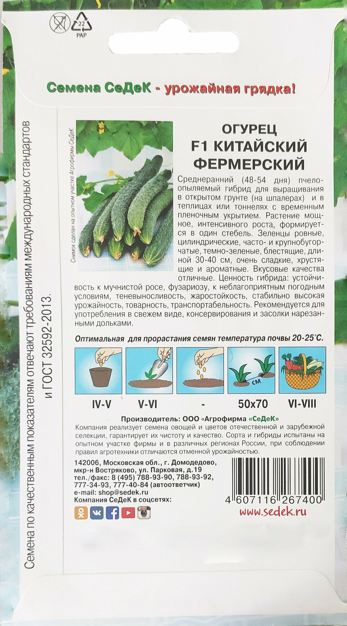 Семена Огурец Китайский Фермерский F1 0,2 г (СеДек) , 2 упаковки * 0,2 г информация: