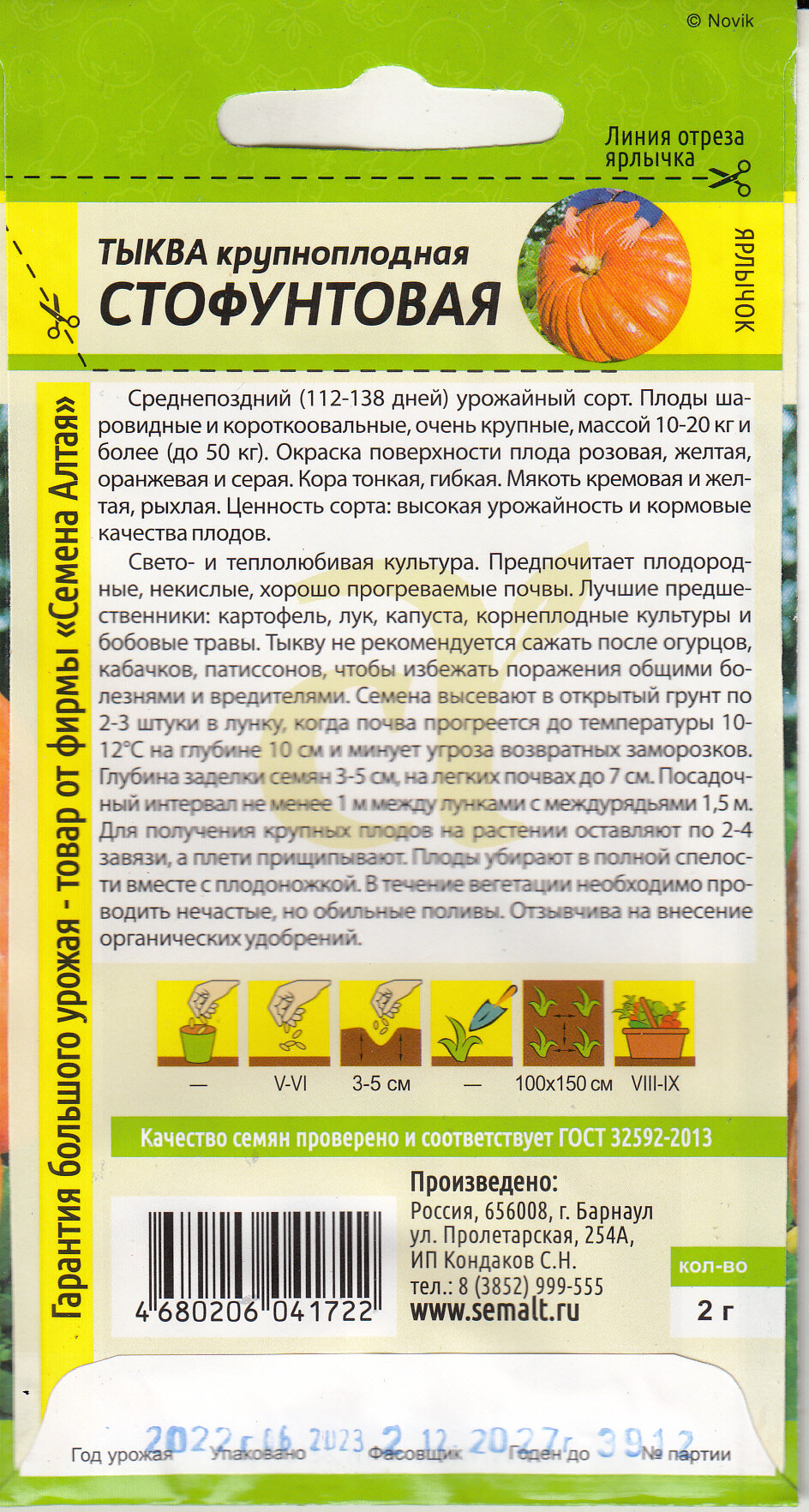Семена Тыква "Стофунтовая", 2 гр. (1шт.) информация: