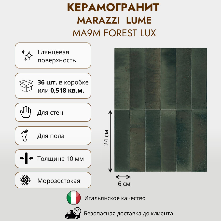 Керамогранит MARAZZI LUME Forest lux MA9M, 6x24 см, темно-зеленый, глянцевый информация: