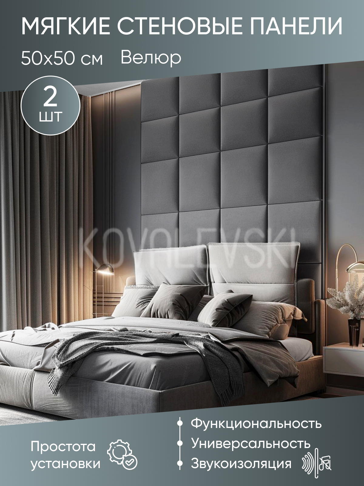 Мягкая стеновая панель 50х50 см, 2 шт серая информация: