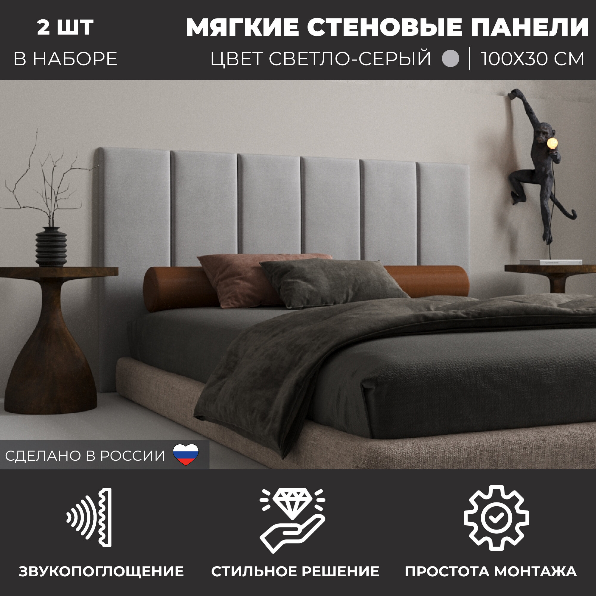 Мягкие стеновые панели, изголовье для кровати 100х30 см, комплект 2 шт, цвет светло-серый информация: