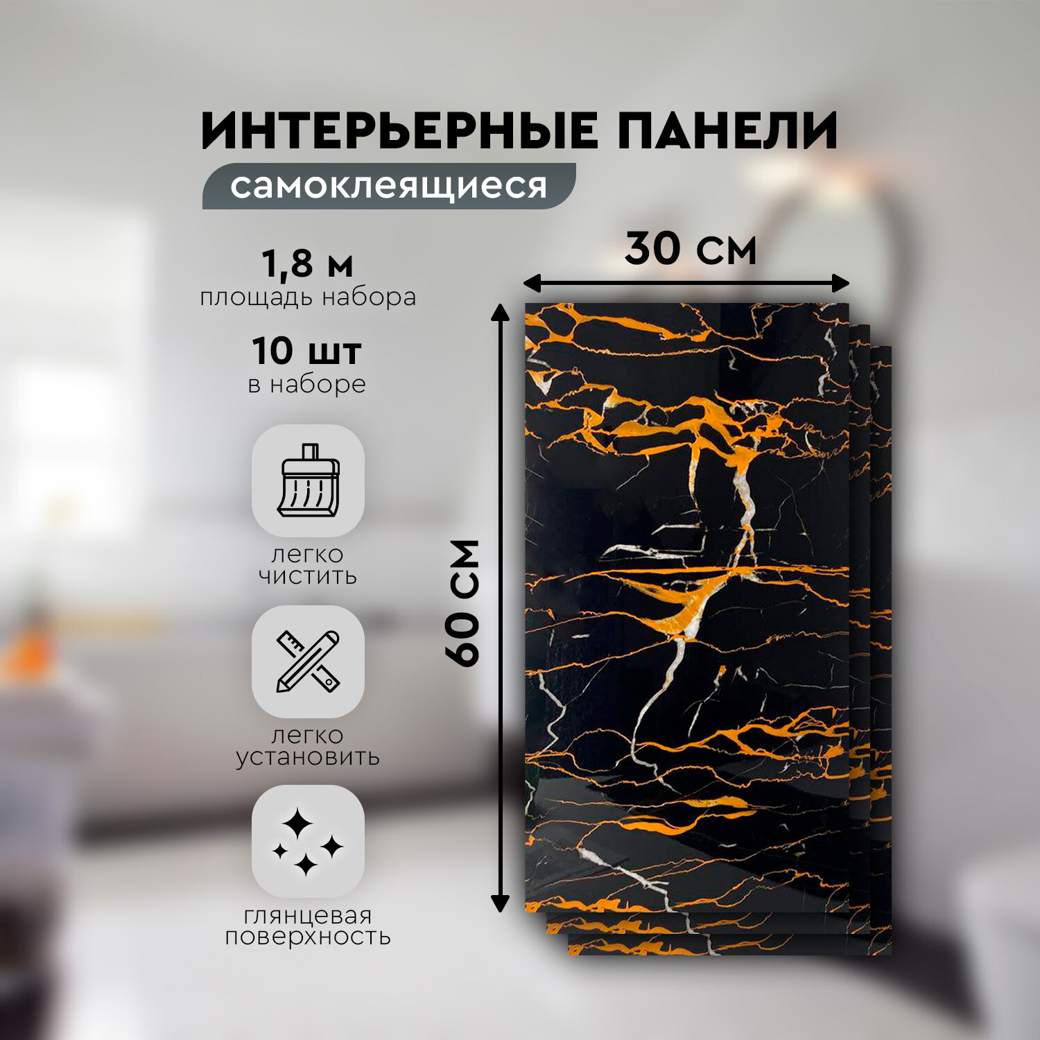 Панели самоклеящиеся для стен 30х60 см. 10 шт. мрамор черный с золотом информация: