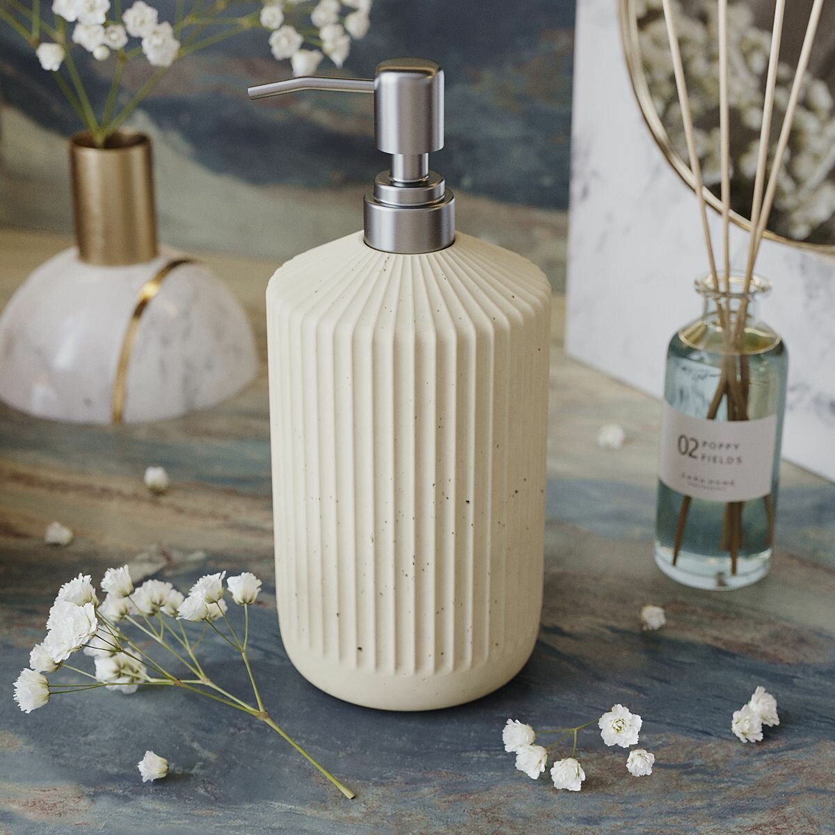 Отзывы на Дозатор для жидкого мыла и моющего средства, диспенсер для мыла с металлической насадкой Chloe, 0,4 л, из бетона, кремовый матовый