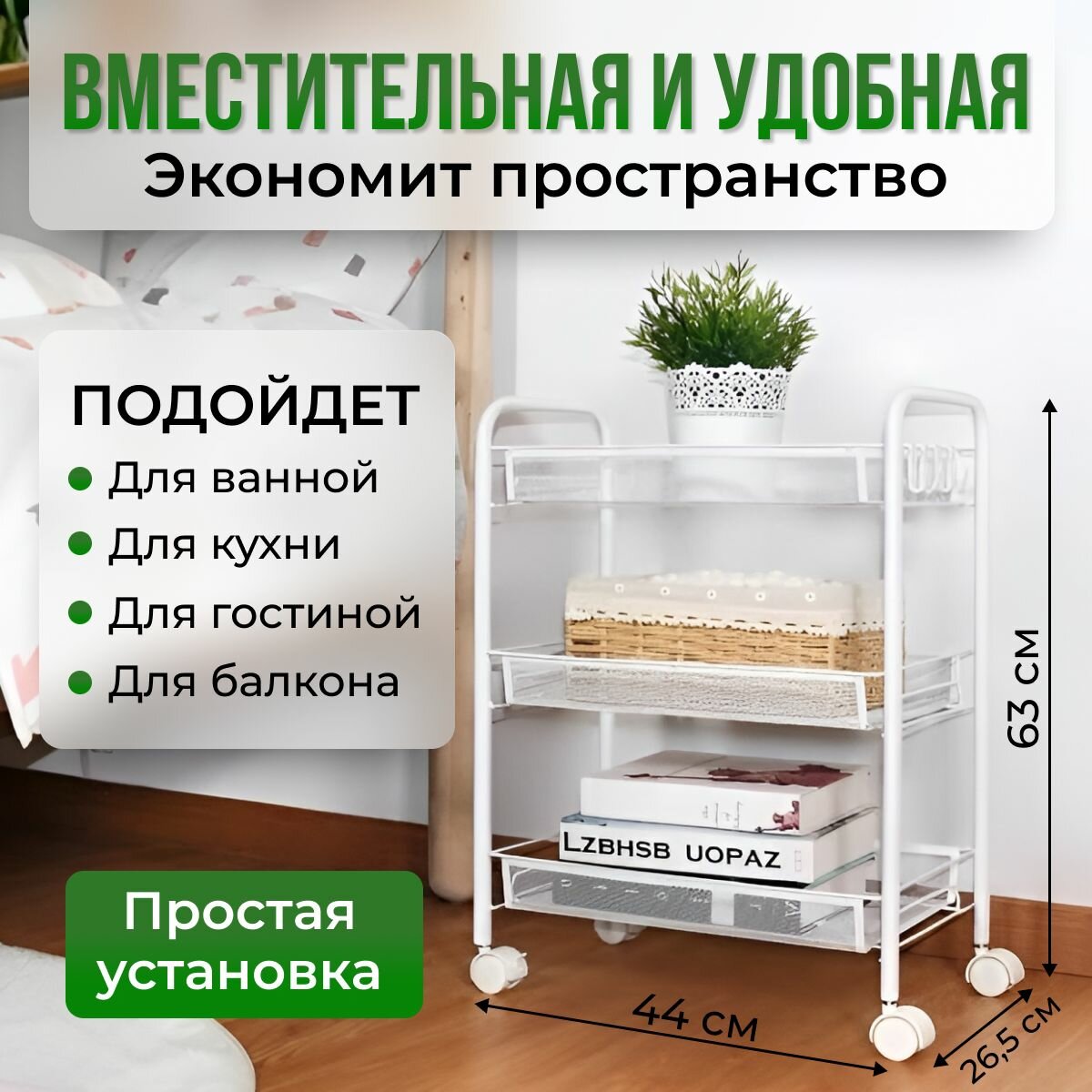 Этажерка на колесиках, Этажерка для ванной, кухни, 44x26x63 см, металл информация: