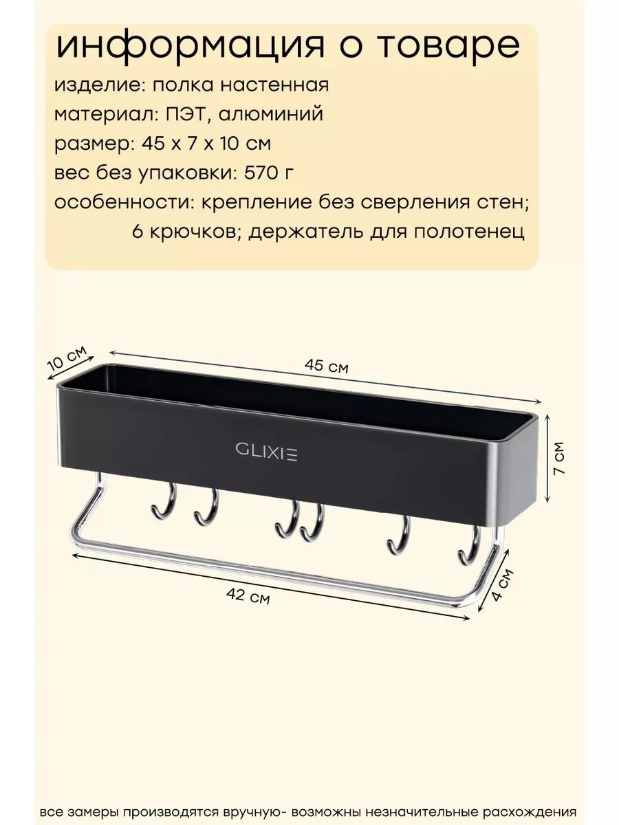 | Комплектация | коробка; клейкая основа-1шт; шестигранник-1шт; болт-2шт; Полка-1шт; полотенцедержатель-1шт; крючки-6шт |