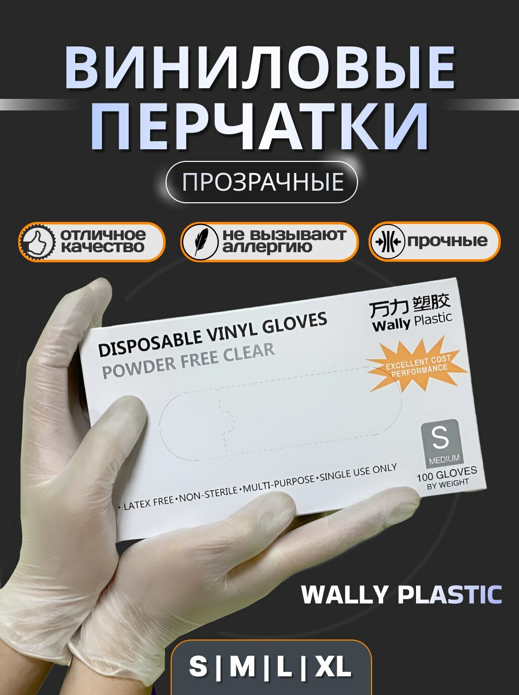 Wally Plastic, Перчатки одноразовые, виниловые, для хозяйственных работ и общепита, прозрачный, 100 шт, L