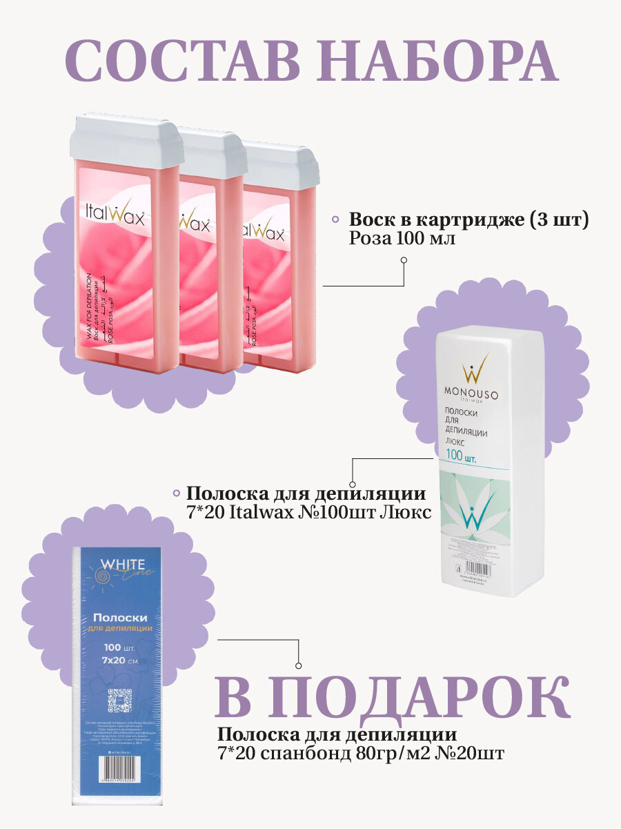 10 цен на ITALWAX Набор для депиляции теплым воском Воск в картридже Роза 3 шт + Полоски для депиляции 7*20 Люкс 100 шт + Подарок италвакс