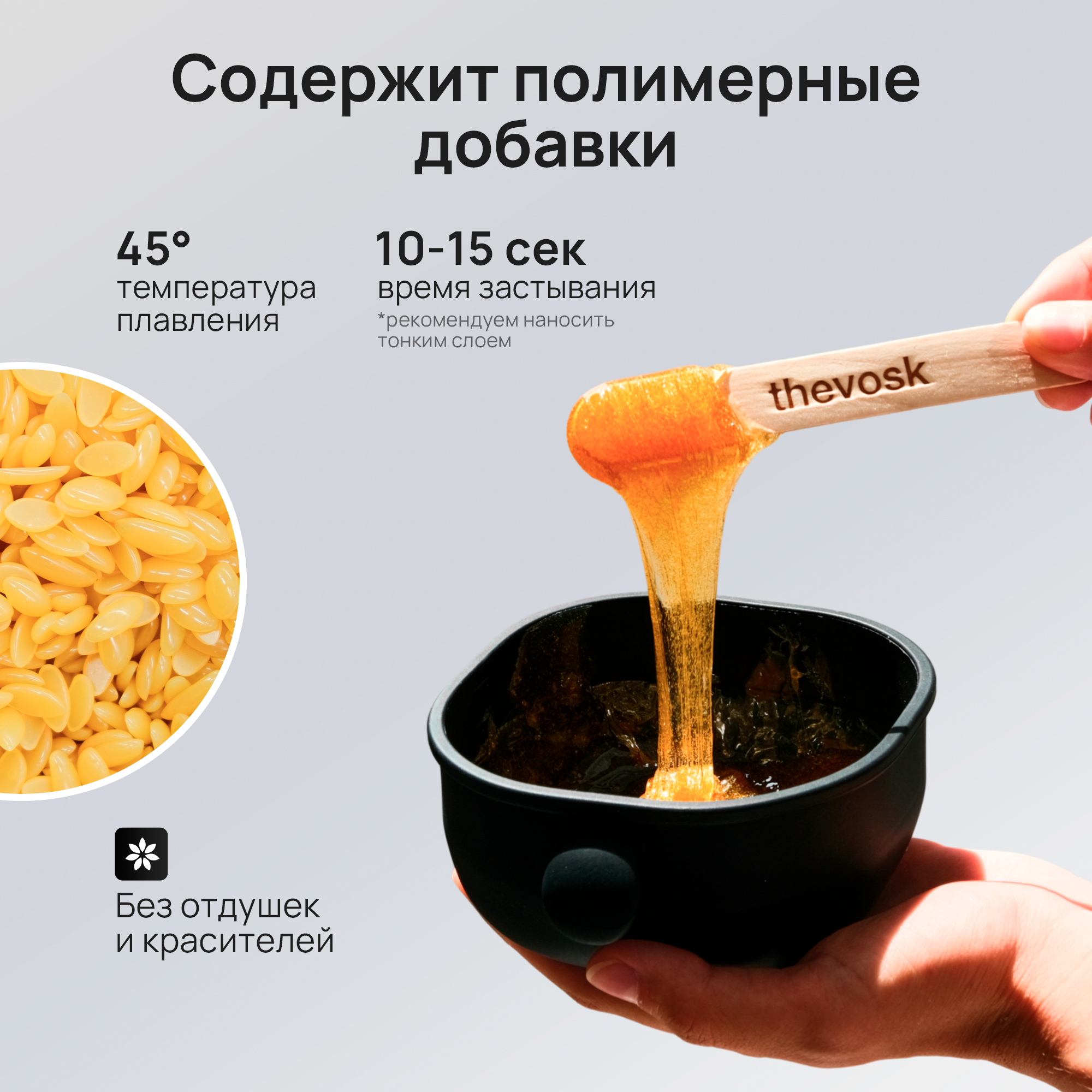 | Способ применения | 1. Подогрейте полимерный пленочный воск до комфортной температуры – 45 градусов в воскоплаве 2. Остудите воск в течении 2 - х минут. 3. Нанести воск при помощи лопатки из дерева на поверхность кожи, оставив его на 5-10 секунд, для застывания. 4. Удалите застывший воск вместе с волосками против роста волос. 5. Обработайте кожу лосьоном после депиляции thevosk. |