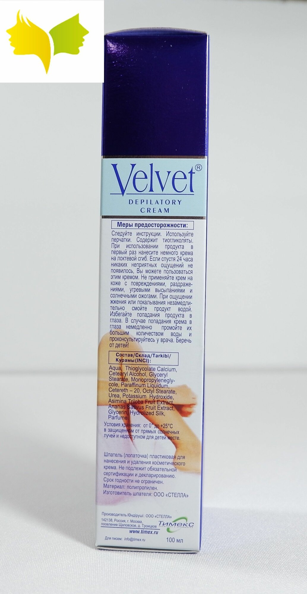 | Способ применения | Устранять волосы кремом для депиляции «Вельвет» просто, для этого не нужно иметь особых косметических навыков. Стоит придерживаться следующих правил использования средств-депиляторов: не использовать на поврежденном эпидермисе (при наличии высыпаний, порезов, ран, ожогов); не рекомендуется наносить на область варикозного расширения вен нижних конечностей; спустя сутки после процедуры исключить нахождение под прямыми солнечными лучами; не посещать баню, сауну, бассейн; сеанс массажа перенести на несколько дней вперед; перед применением провести тест на аллергию. Небольшое количество депилятора намазать на внутреннюю часть локтевого сгиба, подождать полчаса. При наличии негативной реакции отменить использование. Крем достаточно плотной, густой консистенции. Белого цвета, со специфическим запахом. В упаковке вместе с тубой имеется пластиковый шпатель |