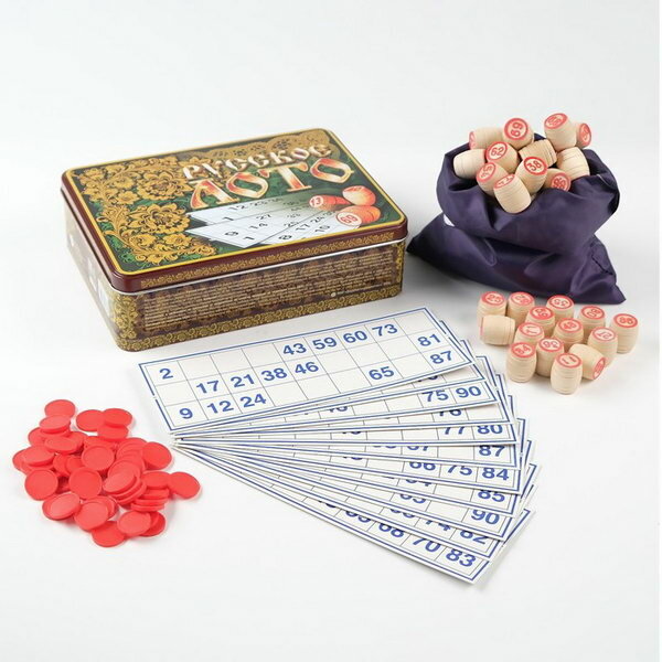 | Подробная комплектация | бочонки 90 шт (высота бочонка – 2,5 см, диаметр – 1,8 см); мешочек; карточки из плотного картона 24 шт (20 х 8,5 см; цвет – белый); жетоны пластиковые 150шт (диаметр – 21 мм); правила игры |