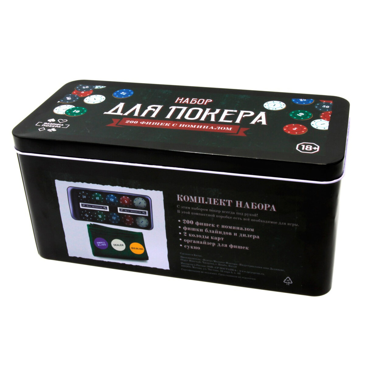 Фабрика Покера: Набор из 200 фишек с номиналом для покера с картами и сукном в жестяной коробке информация: