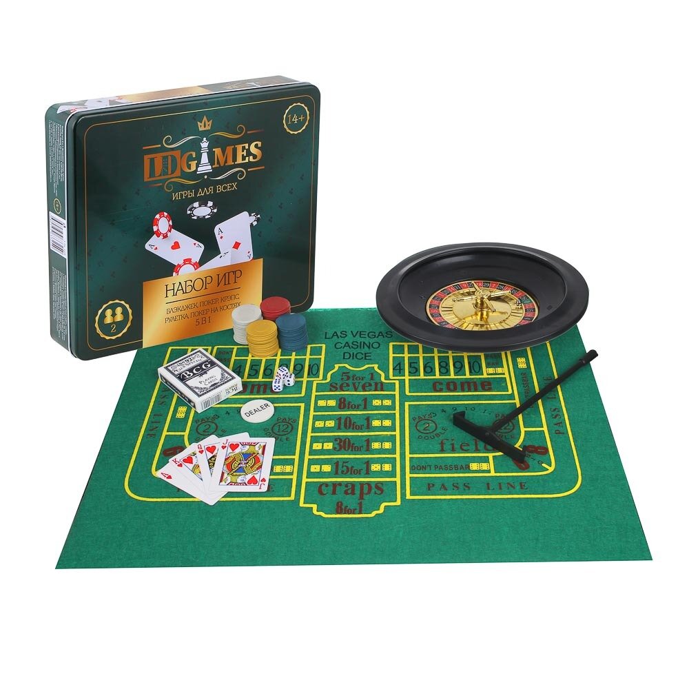 LDGames Набор игр 5в1 (блэкджек, покер, крэпс, рулетка, покер на костях) 7,25х32х28см, в метал.короб информация: