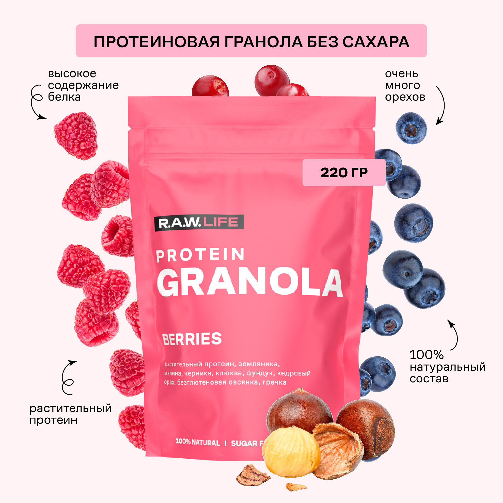 Гранола протеиновая/ R.A.W. LIFE/Ягоды/220гр / Без сахара/ Без глютена информация: