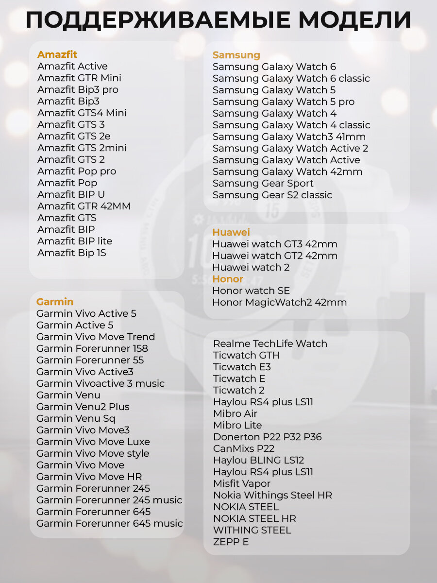 | Совместимость | Amazfit Bip / Amazfit Bip 3 / Amazfit Bip 3 Pro / Amazfit Bip Lite / Amazfit GTR 42 мм / Amazfit GTS / Amazfit GTS 2 / Amazfit GTS 2 mini / Amazfit GTS 2e / Amazfit GTS 3 / Amazfit GTS 4 mini / Amazfit Pop Pro / Garmin Forerunner 645 / Garmin Venu / Garmin Venu 2 Plus / Garmin Venu Sq / Garmin Vivoactive 3 / Garmin Vivomove 3 / Garmin Vivomove HR / Garmin Vivomove Luxe / Garmin Vivomove Style / Haylou RS4 PLUS / Honor MagicWatch 2 42 мм / Huawei Watch 2 / Huawei Watch GT 2 / Huawei Watch GT3 42 мм / Samsung Galaxy Watch Active / Samsung Galaxy Watch Active2 40мм / Samsung Galaxy Watch3 41мм / Samsung Galaxy Watch5 Pro / Samsung Gear S2 Classic / Samsung Gear Sport / realme TechLife Watch S100 |