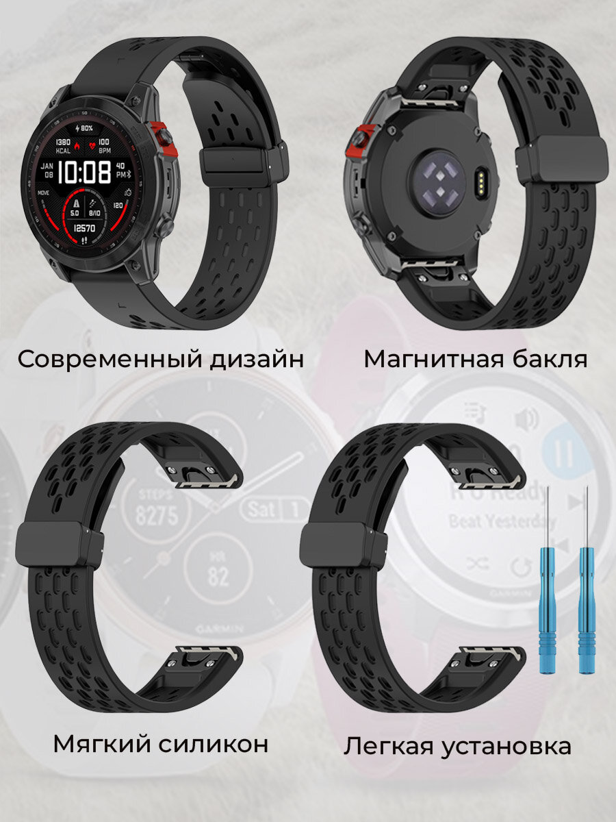Силиконовый ремешок для Garmin Fenix / Instinct / Forerunner / Vivomove, 20 мм, c магнитной застежкой, черный 874 ₽