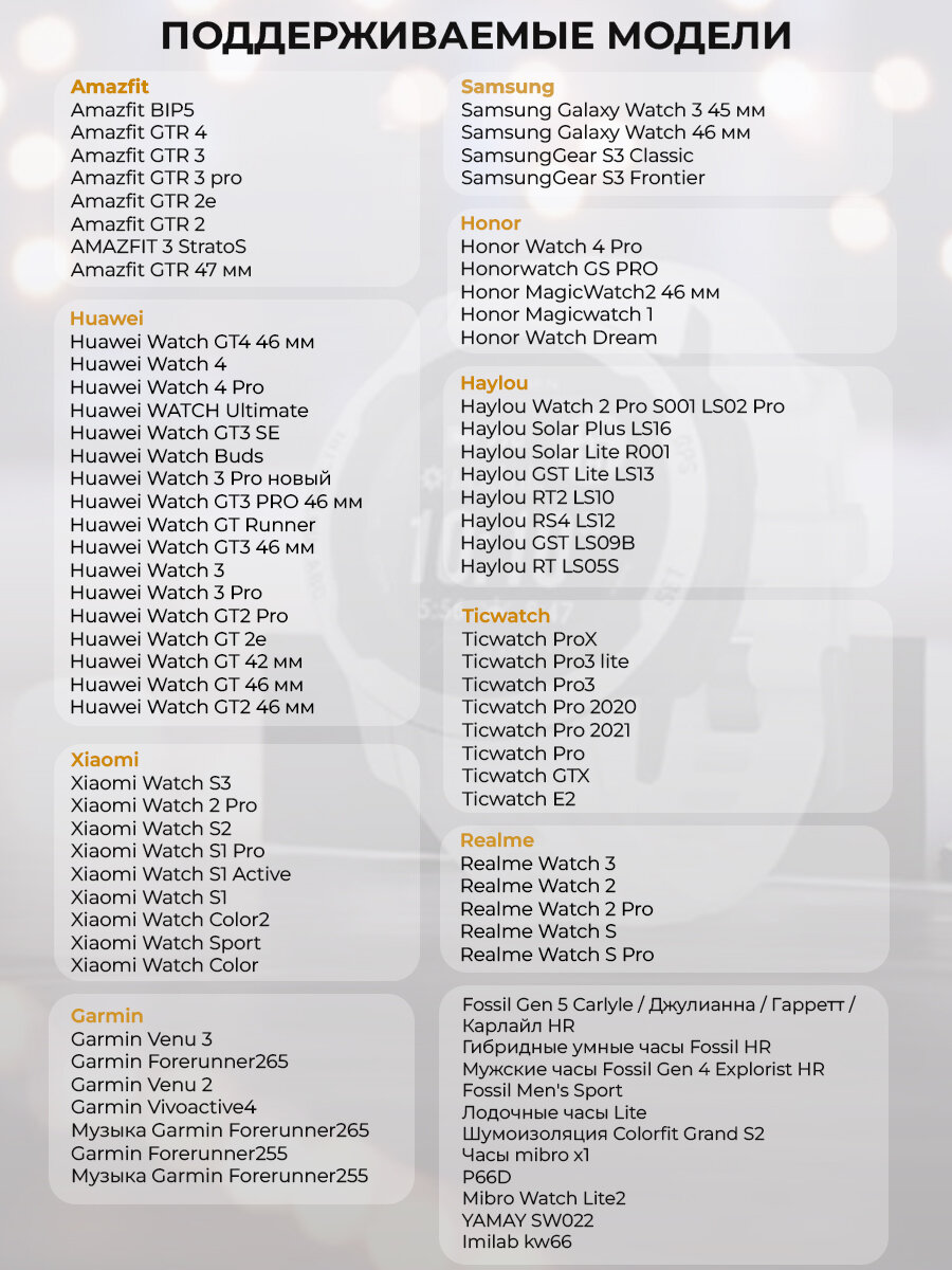 | Совместимость | Amazfit GTR 2e / Amazfit GTR 3 Pro / Amazfit GTR 4 / Amazfit GTR 47 мм / Amazfit GTS 2 / Amazfit Stratos / Garmin Forerunner 255 / Garmin Venu 2 / Garmin Vivoactive 4 / HONOR Watch Dream / Haylou RT LS05S / Haylou RT2-LS10 / Honor Watch GS Pro / Honor Watch Magic / Huawei Watch 3 Pro / Huawei Watch GT 2 Pro / Huawei Watch GT 2e / Huawei Watch GT 42 мм / Huawei Watch GT 46 мм / Huawei Watch GT2 46 мм / Huawei Watch GT3 46 мм / IMILAB KW66 / Samsung Galaxy Watch 46 мм / Samsung Galaxy Watch3 45 мм / Samsung Gear S2 Classic / Samsung Gear S3 Frontier / Xiaomi Watch S1 / Xiaomi Watch S1 Active / realme Watch 2 / realme Watch 2 Pro |