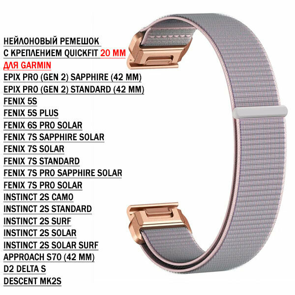 Отзывы на Ремешок QuickFit 20 мм нейлоновый для Garmin Fenix 7S / 6S / 5S, Instinct 2S, Epix Pro Gen 2 (42 mm) велкро (Розово-серый золото)