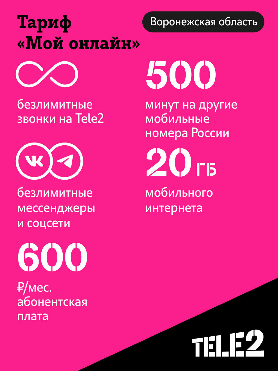 Sim-карта Tele2 для Воронежской области, баланс 300 рублей информация: