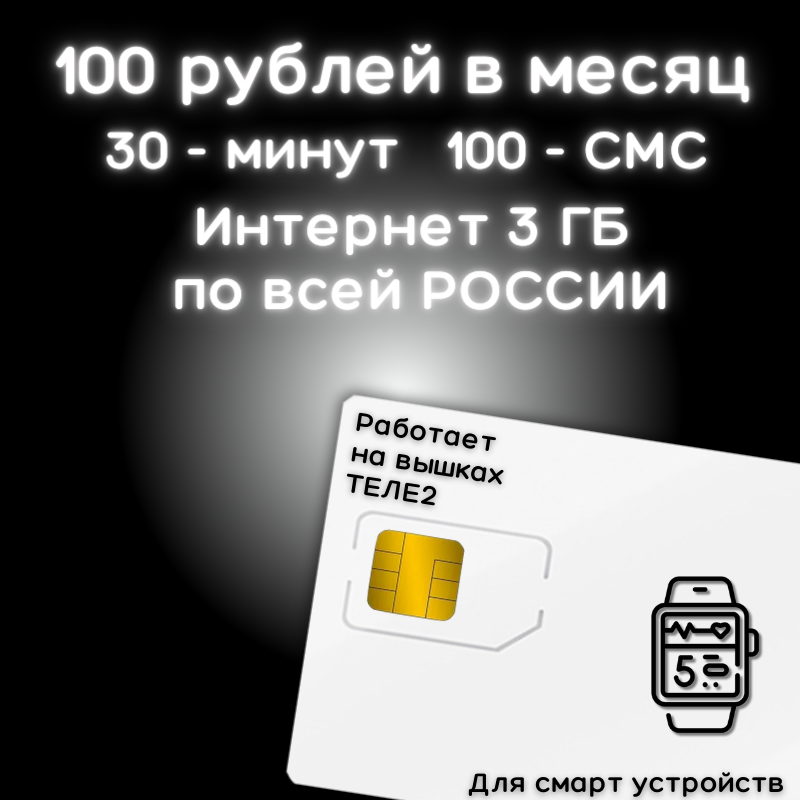 Сим карта интернет для смарт часов и умных устройств 100 рублей в месяц по РФ 3 ГБ 4G LTE YAT2V2 информация: