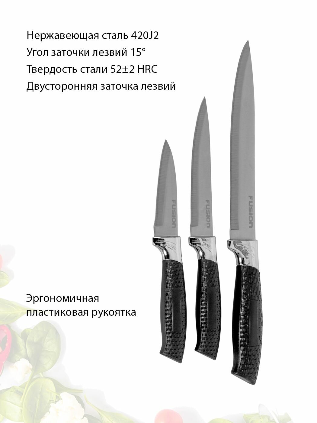 Набор кухонных ножей 3 шт Fusion SK3004, black (нож для чистки и нарезки овощей и фруктов, универсальный, нож для нарезки-слайсер) информация: