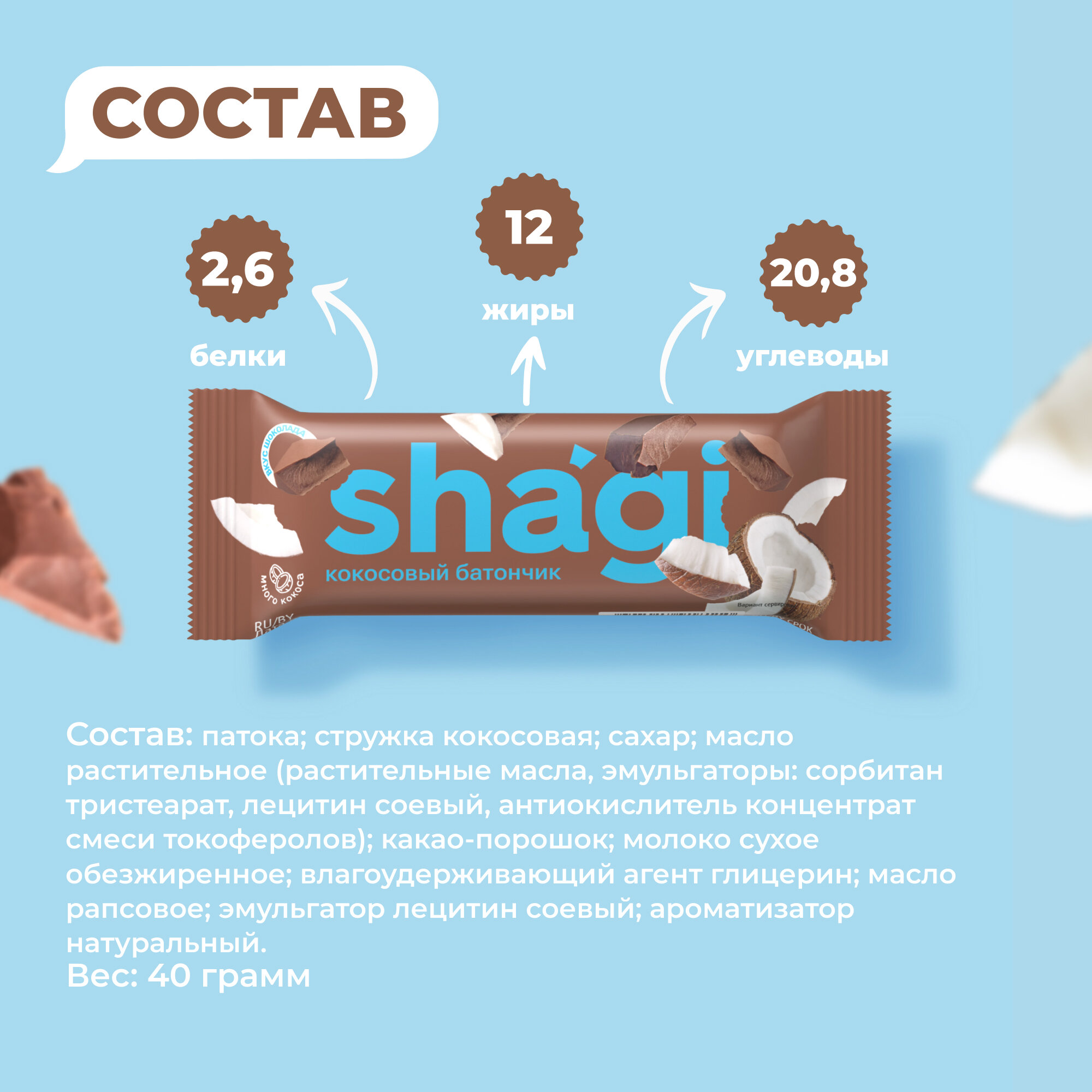 Батончик кокосовый Shagi Шоколад, 40 гр х 15 шт, спортпит, пп, полезные сладости, спорт, десерты информация: