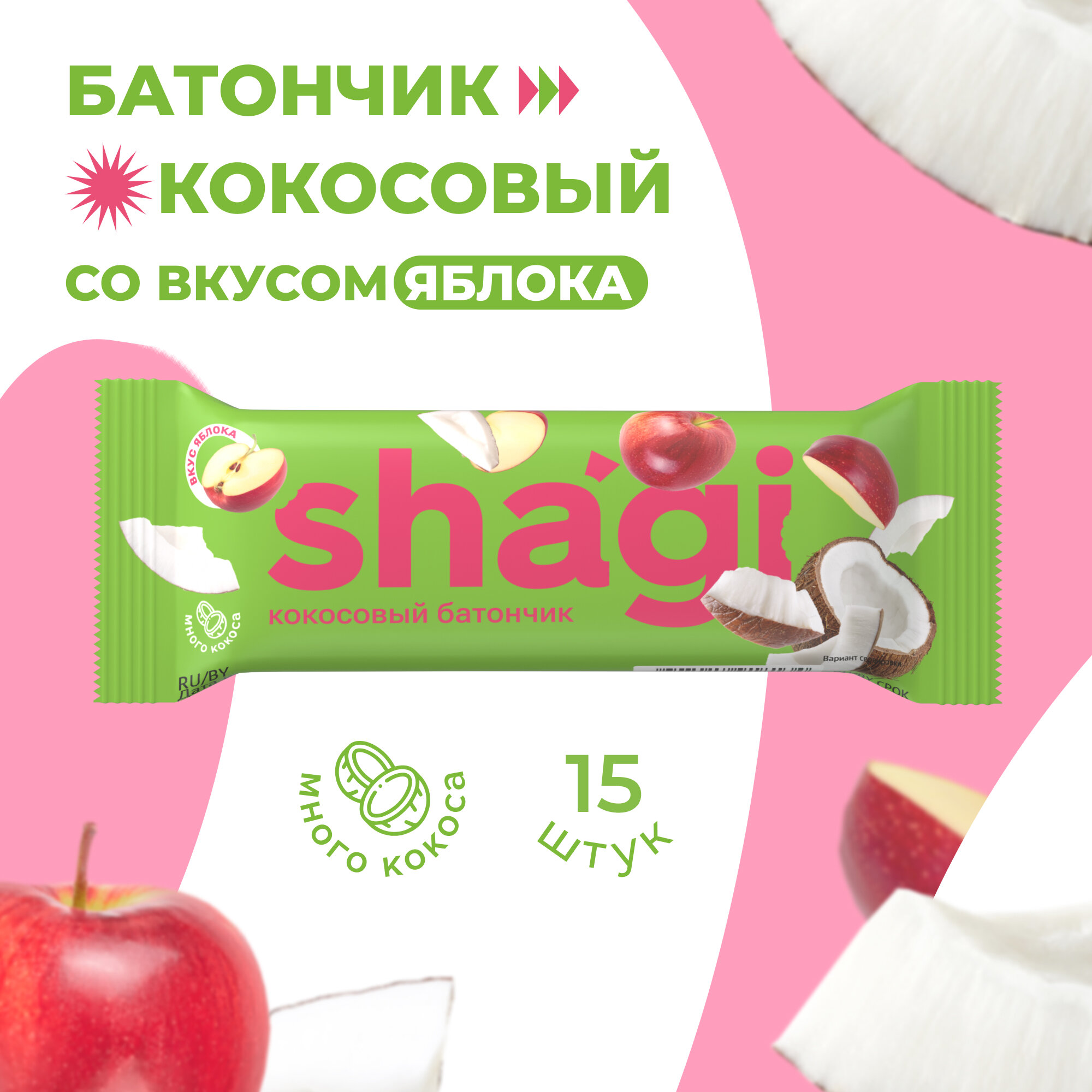 Батончик кокосовый Shagi яблоко, 40 гр х 15 шт, спортпит, пп, полезные сладости, спорт, десерты информация: