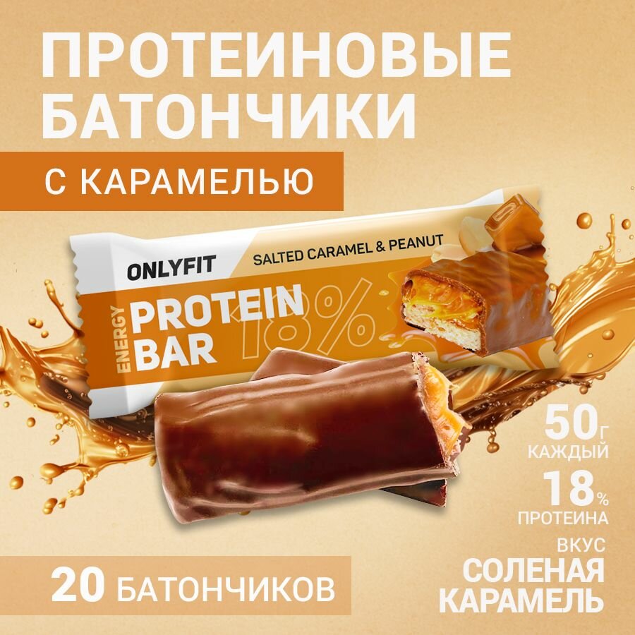Протеиновый батончик ONLYFIT, глазированный с карамелью, вкус "Соленая карамель и Арахис" 20 штук по 50г информация: