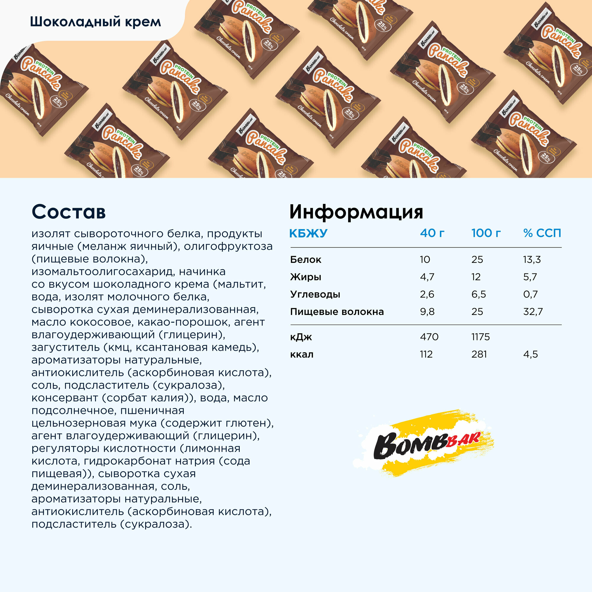Bombbar Протеиновые печенья (панкейки) с начинкой без сахара "Шоколадный крем", 10шт х 40г информация: