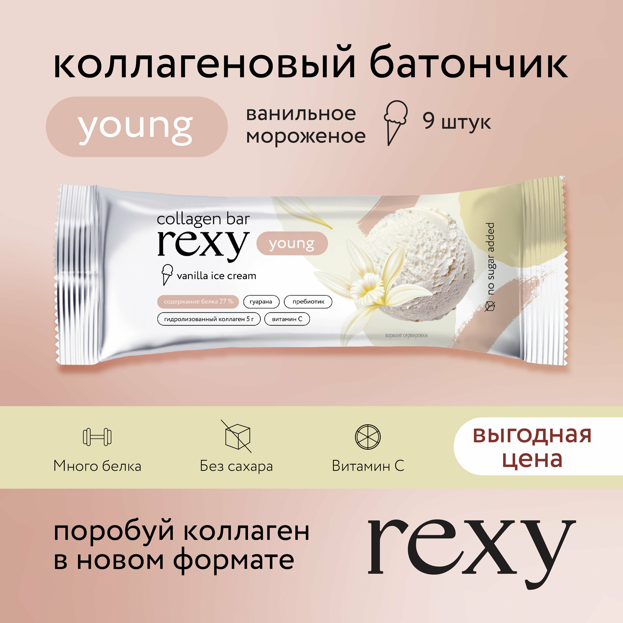 10 цен на Протеиновые батончики rexy young Ванильное мороженое, 9шт х 35г, без сахара 130ккал, ПП сладости, спортпит, с коллагеном