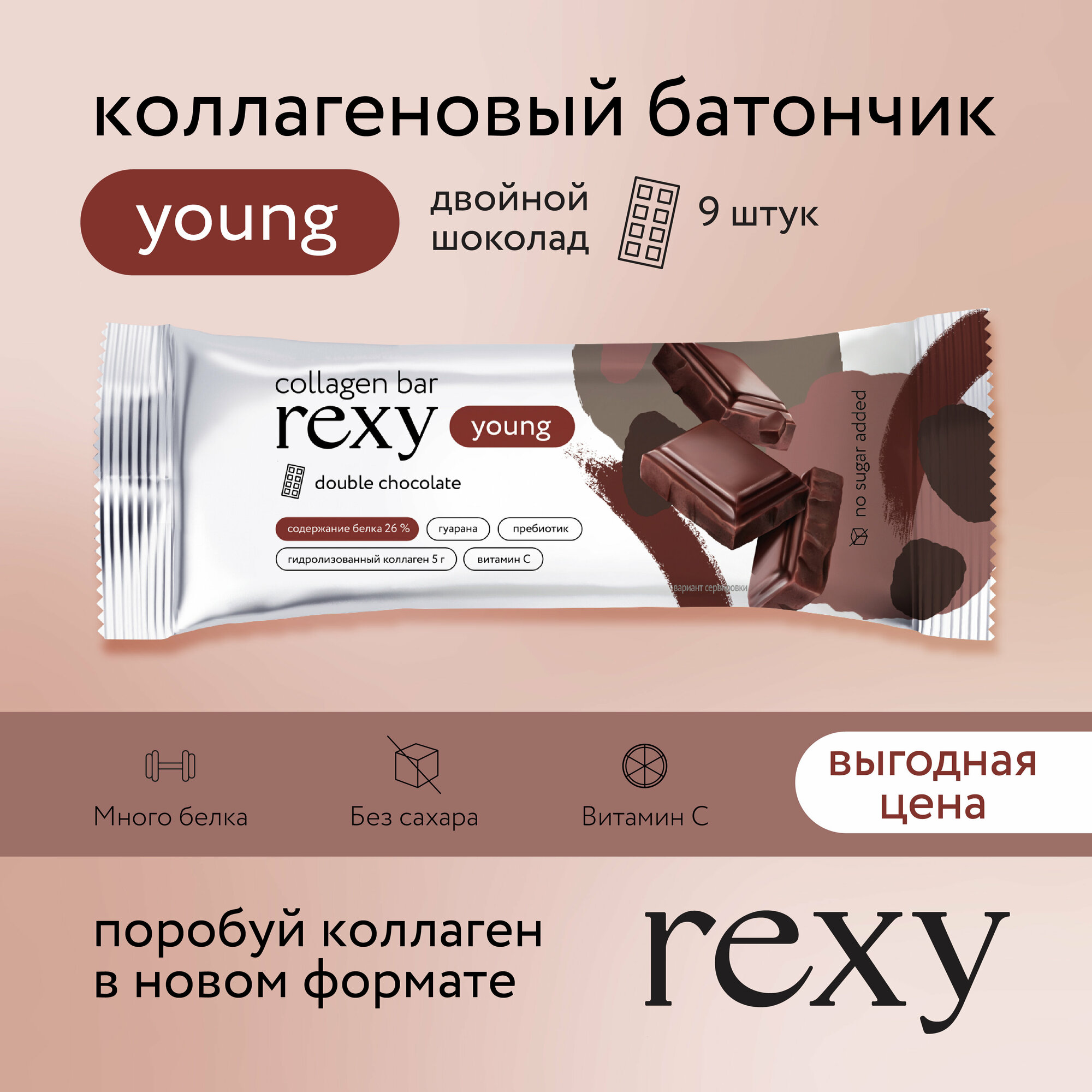 Протеиновые батончики rexy YOUNG с коллагеном Двойной шоколад, 9шт 35г, 130ккал, спортивные батончики ProteinRex информация: