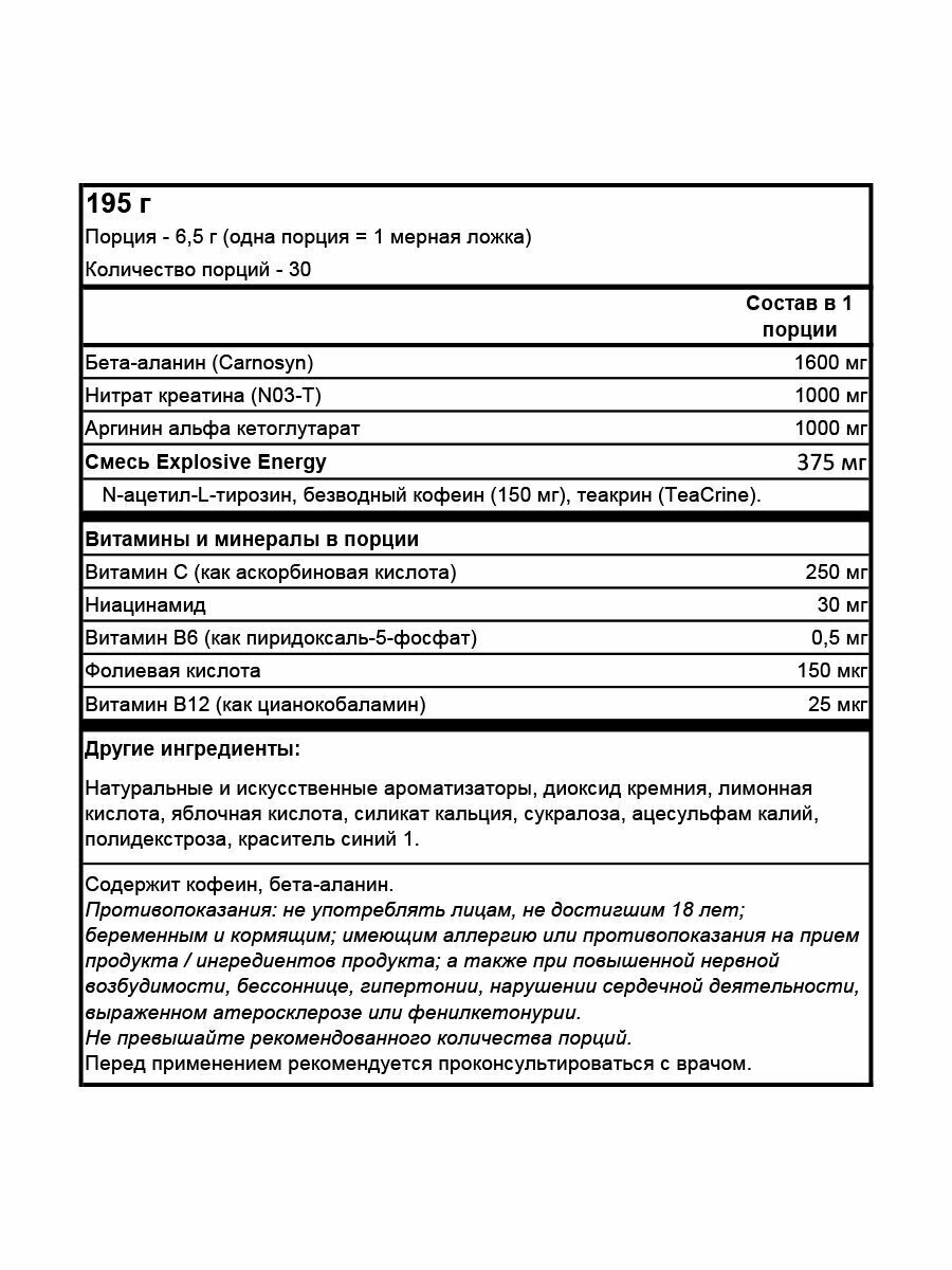 | Основные ингредиенты | BCAA / аргинин / бета-аланин / витамины и минералы / кофеин / креатин |