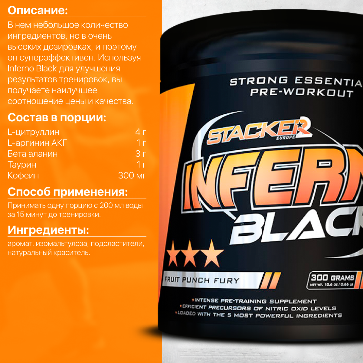 Предтренировочный комплекс Stacker2 Inferno Black, фруктовый пунш, 300 гр. + кофеин информация: