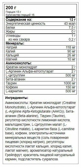 | Основные ингредиенты | аргинин / бета-аланин / кофеин / креатин / таурин |