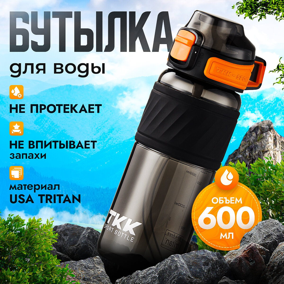 Отзывы на Спортивная фитнес бутылка фляга для воды TKK Premium из тритана с ручкой, 600 мл, чёрная