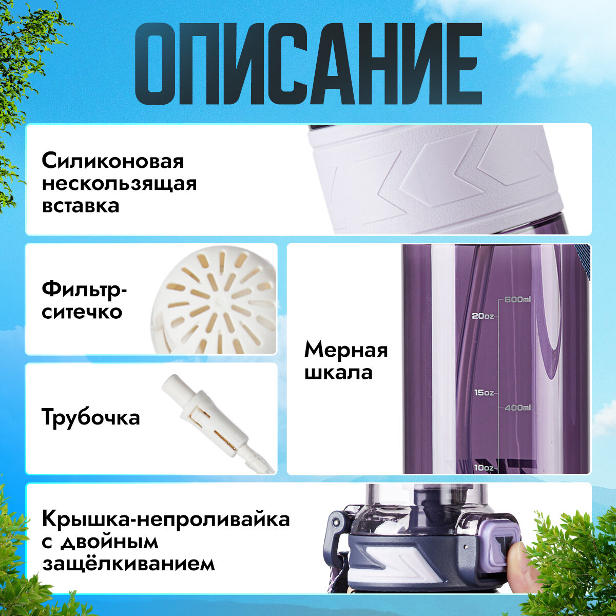 | Особенности | закрывается на замок, клапан, мерная шкала, петля для переноски, подходит для мытья в посудомоечной машине, с карабином, с ручкой, с трубочкой, силиконовая вставка на корпусе, система ношения для руки, фильтрующая сетка |