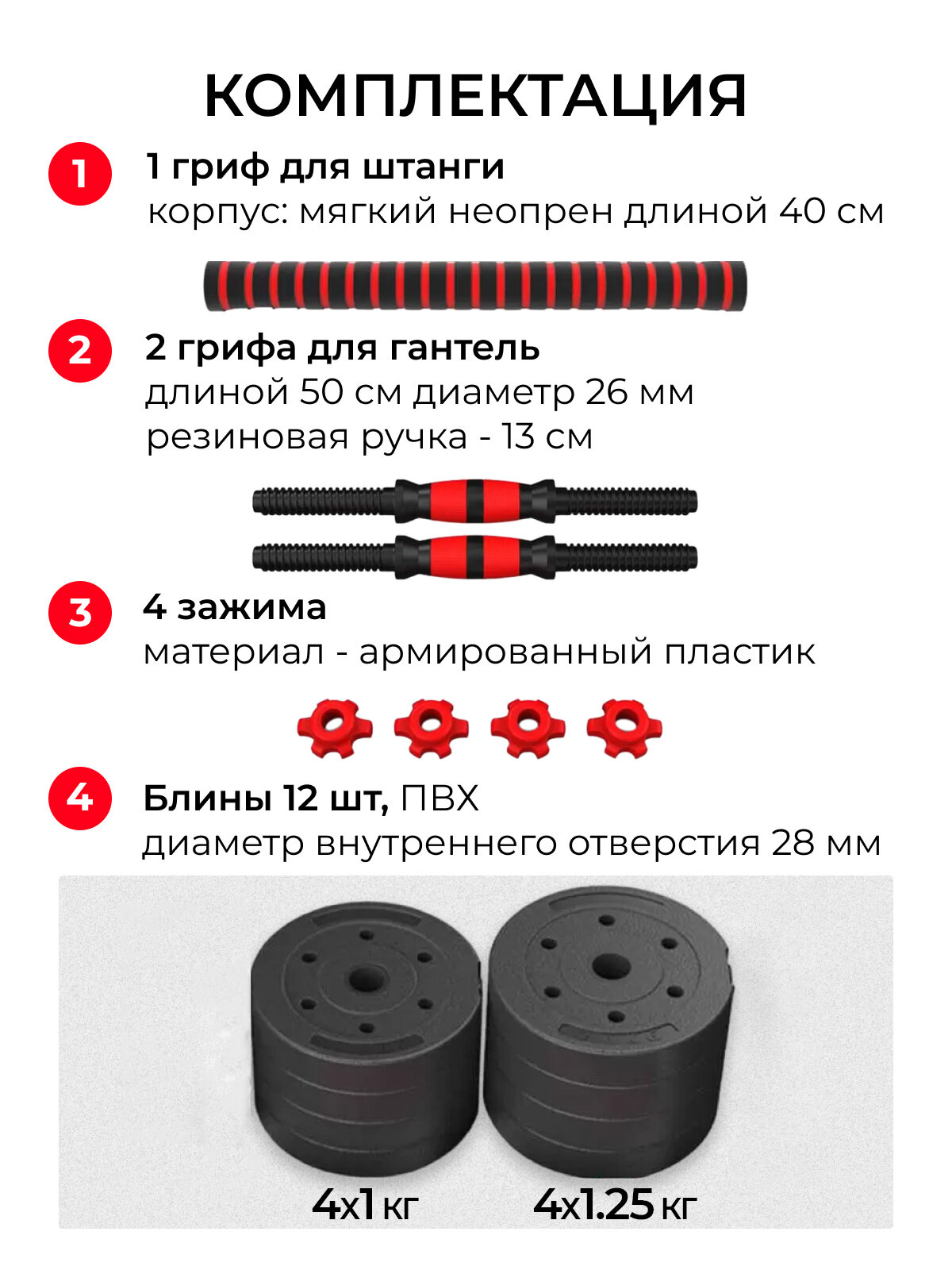 | Покрытие | диски - пластик, гриф - неопрен |