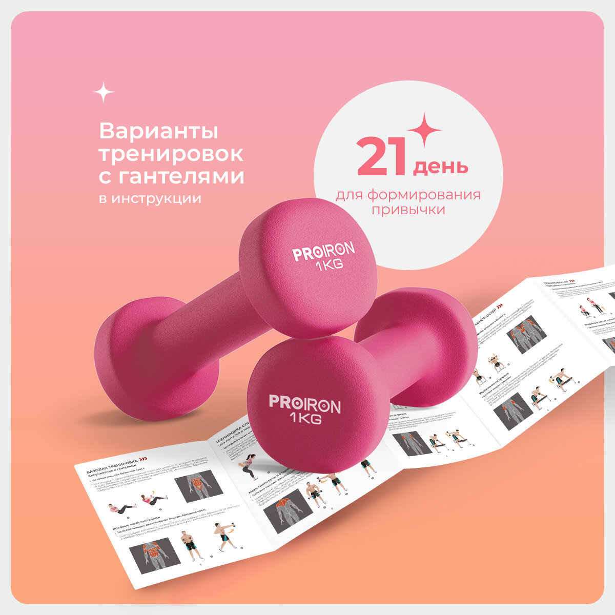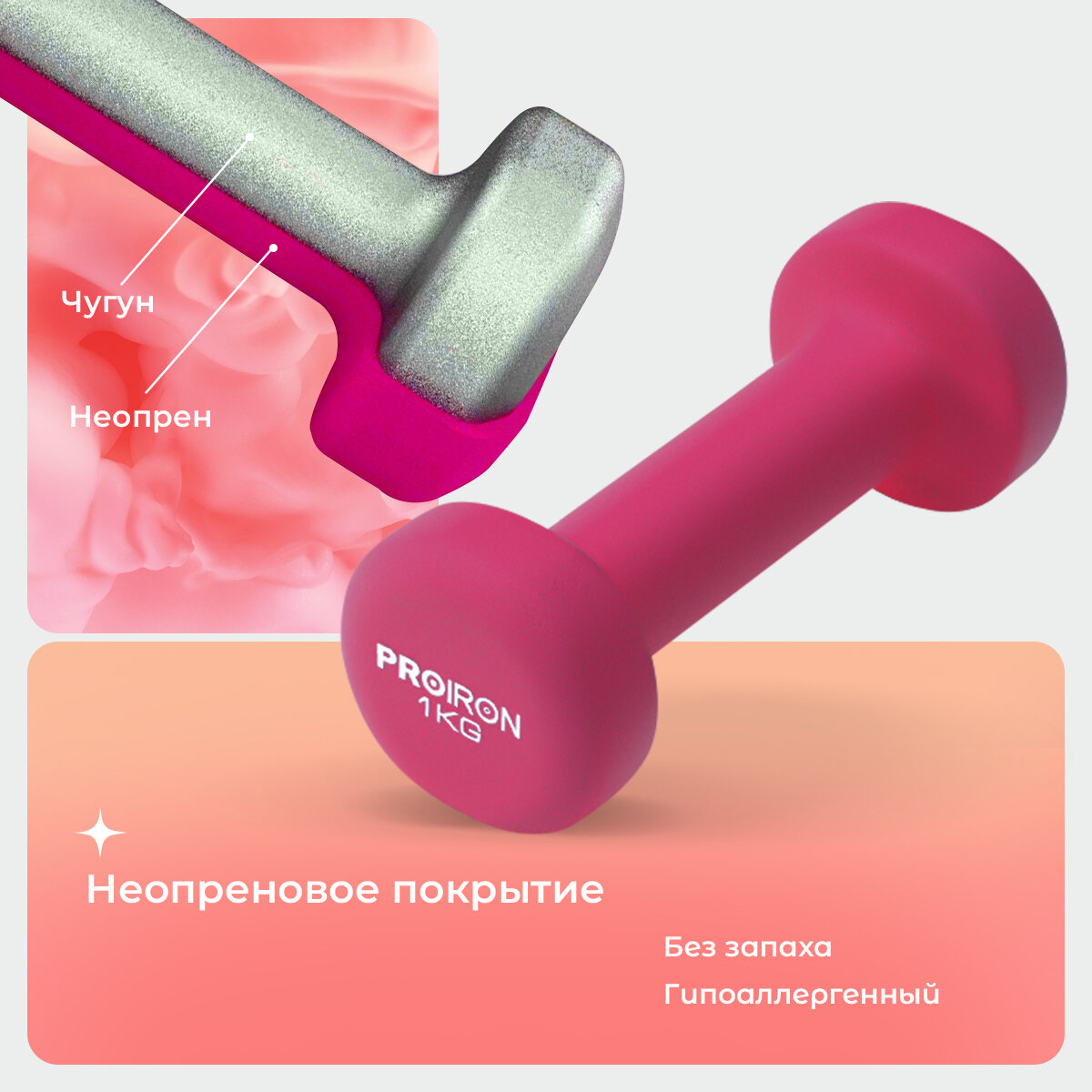 Гантели 1 кг 2 штуки неопреновые PROIRON, набор для фитнеса, розовые информация: