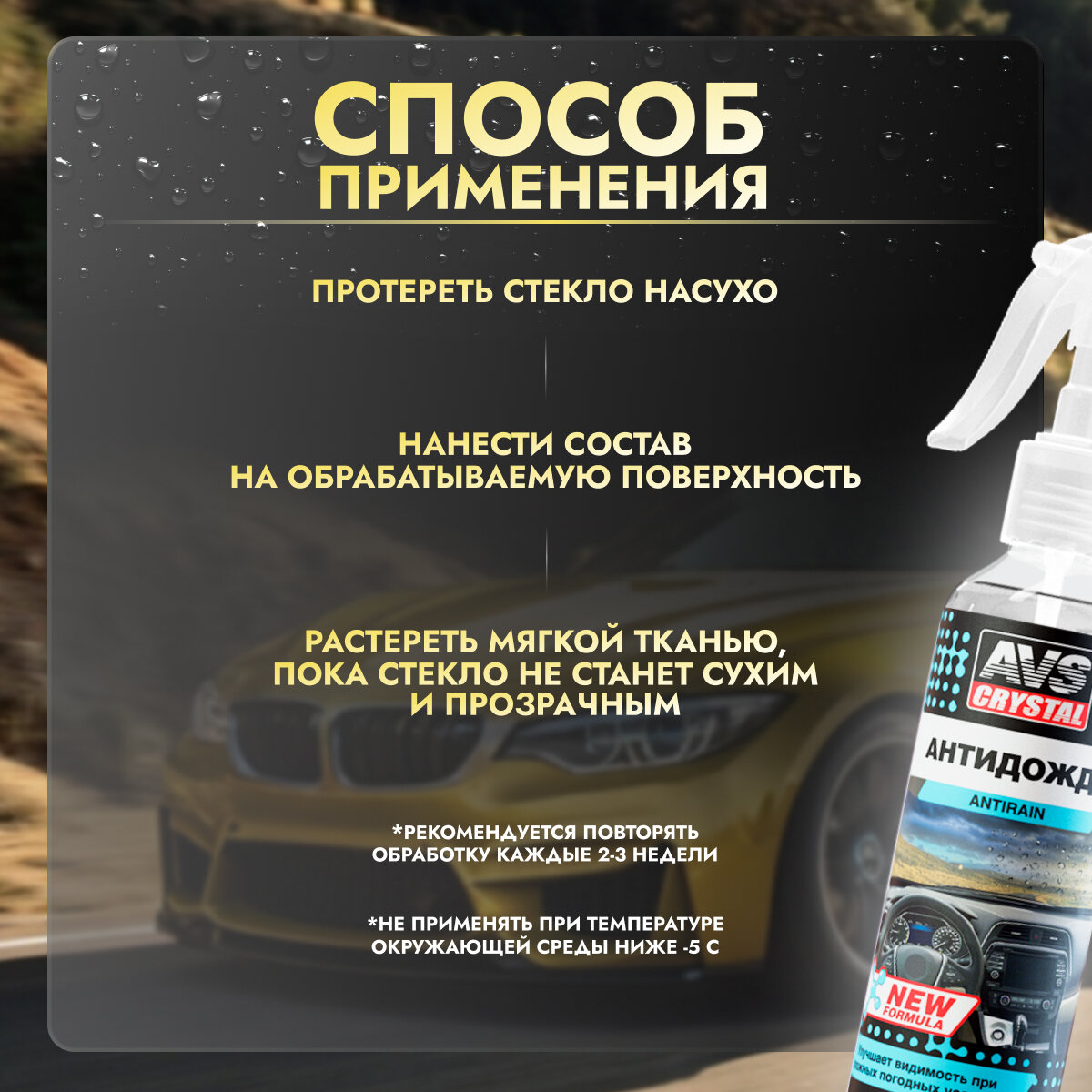 Антидождь AVS Crystal для автостекол, фар и визоров мотоциклов, 250мл информация: