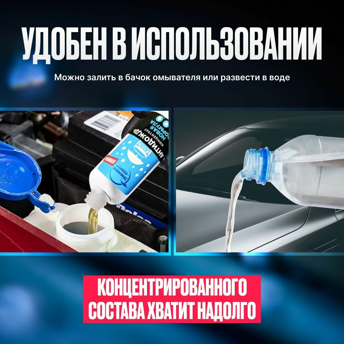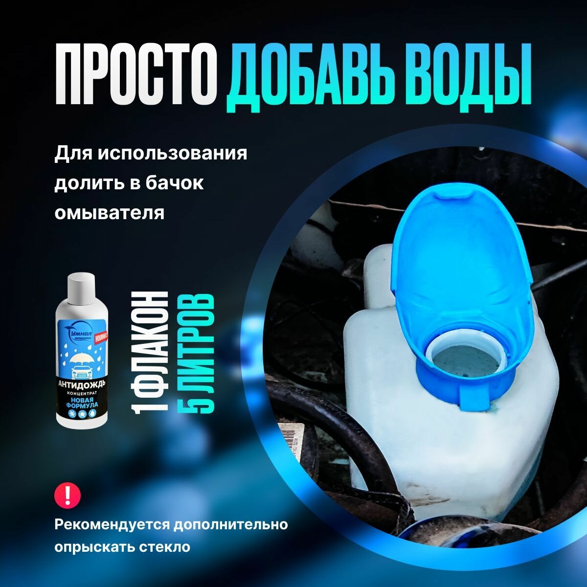 | Способ применения | Инструкция по применению концентрата «УМНАЯ АВТОХИМИЯ» 1. Взболтать флакон с содержимым и залить в бачок с омывающей жидкостью 2. Долить в бак до конца омывающую жидкость, воду или незамерзайку. 3. Распылить 200-400 мл готового состава на стекло и распределить с помощью стеклоочистителей. 4. В дальнейшем пользоваться так же, как и омывающей жидкостью. 5. В случае ослабления эффекта необходимо повторно добавить состав на стекло. Средство «УМНАЯ АВТОХИМИЯ» образует на поверхности стекла прозрачный и прочный слой гидрофобного полимера, который устойчив к спирту, моющим средствам и автошампуням. В случае появления белых пятен на стекле, связанных с избыточным расходом средства, располировать салфеткой из микрофибры. |