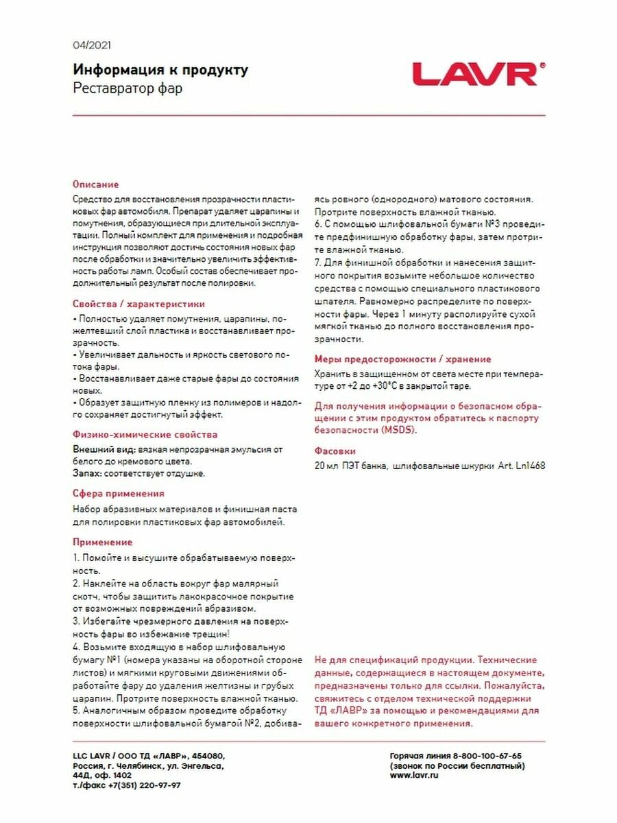 | Действие | восстанавливает прозрачность фар |