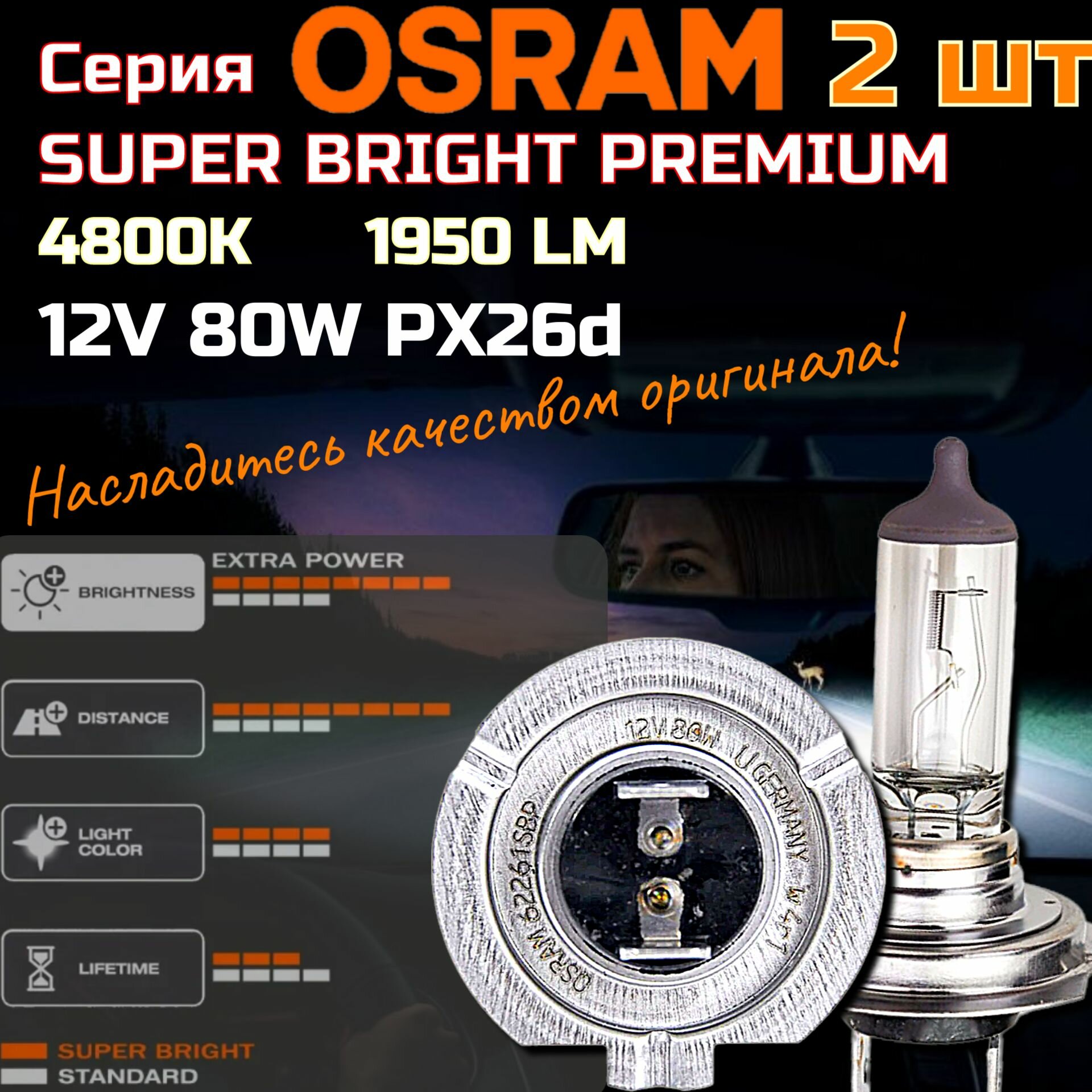 10 цен на Лампы автомобильные галогенные H7 OSRAM SUPER BRIGHT PREMIUM 12V 80W, 62261SBP 2 шт.